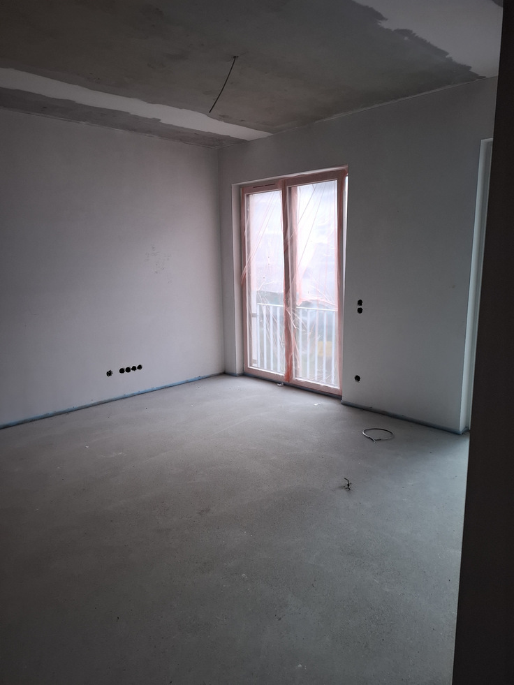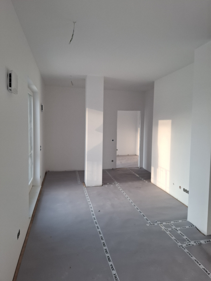 The drywall installation and technical equipment line placement are currently in progress, with plastering works scheduled to begin within the next two weeks. Inside, the spaces are beginning to take shape, with flooring preparation underway — a clear sign of the transformation from shell to finished residence.